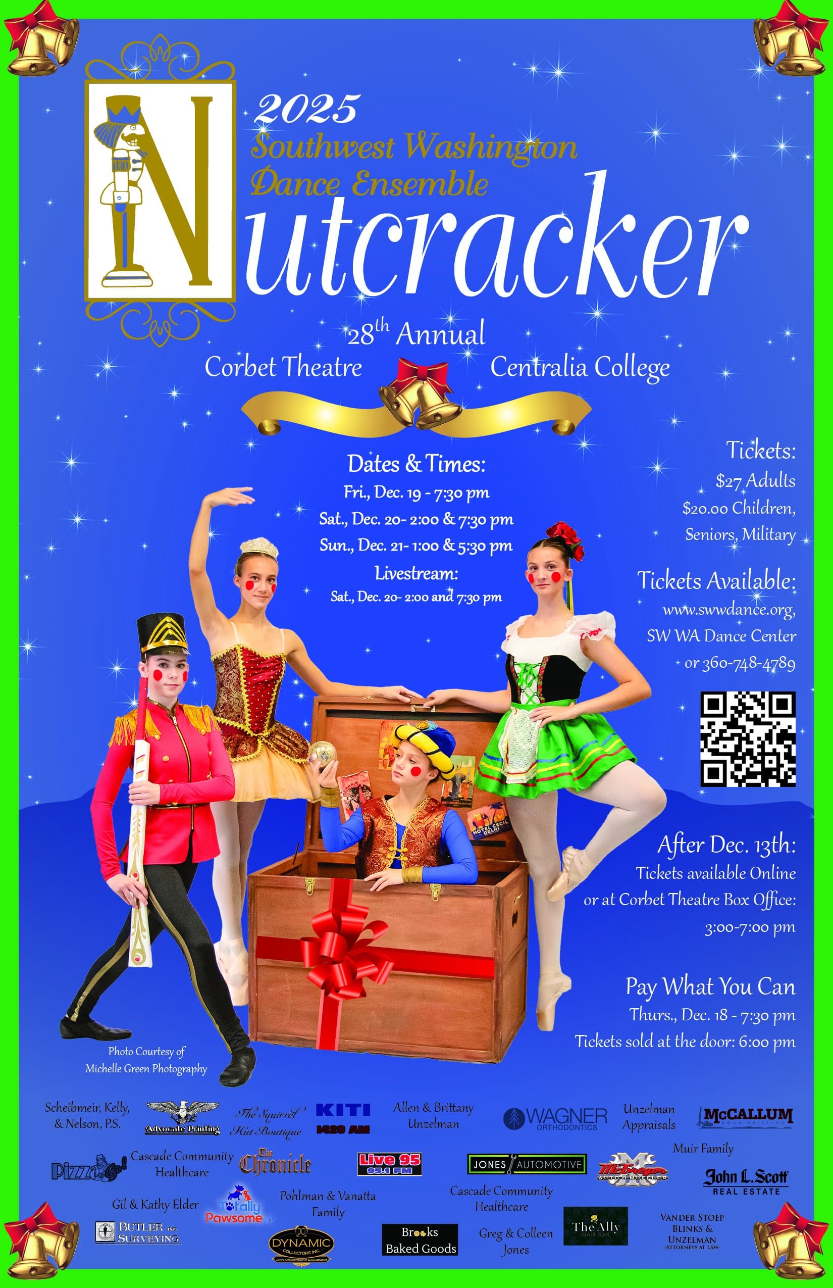 Southwest Washington Dance Center’s performing company, Southwest Washington Dance Ensemble, will present the 28th annual production of “The Nutcracker.” The ballet will take place in the “state-of-the-art” Corbet Theatre on the Centralia College campus on December 18, 19, 20, and 21. Performance times are 7:30pm on December 18 and 19, 2pm and 7:30pm on December 20, and 1pm and 5:30pm on December 21.